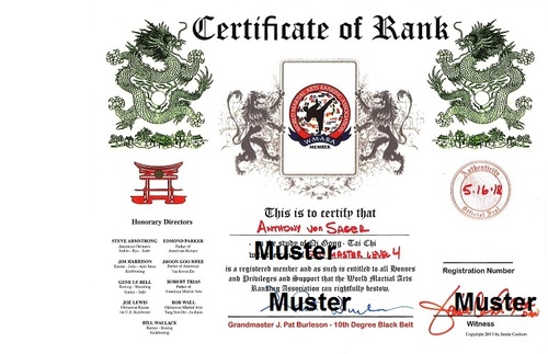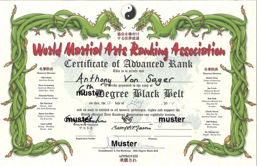 Dazu kommt noch das unsere jährlichen Mitgliedsbeiträge "nur" 25 $ - 50 $ je nach Rang betragen. Natürlich müssen wir die Zertifikate in Rechnung stellen, aber dies ist nur eine einmalige Gebühr! Verdient ist Verdient, niemals erneut zertifizieren! Wir berechnen wie jeder andere Org. auch die Bildungs und Meisterklassen. Wir müssen natürlich auch unsere eigenen Schulleiter, Lehrer, und Prüfer sowie unsere Testeinrichtungen bezahlen, genau wie bei jedem anderen Test oder Stil der Kampfkünste.
