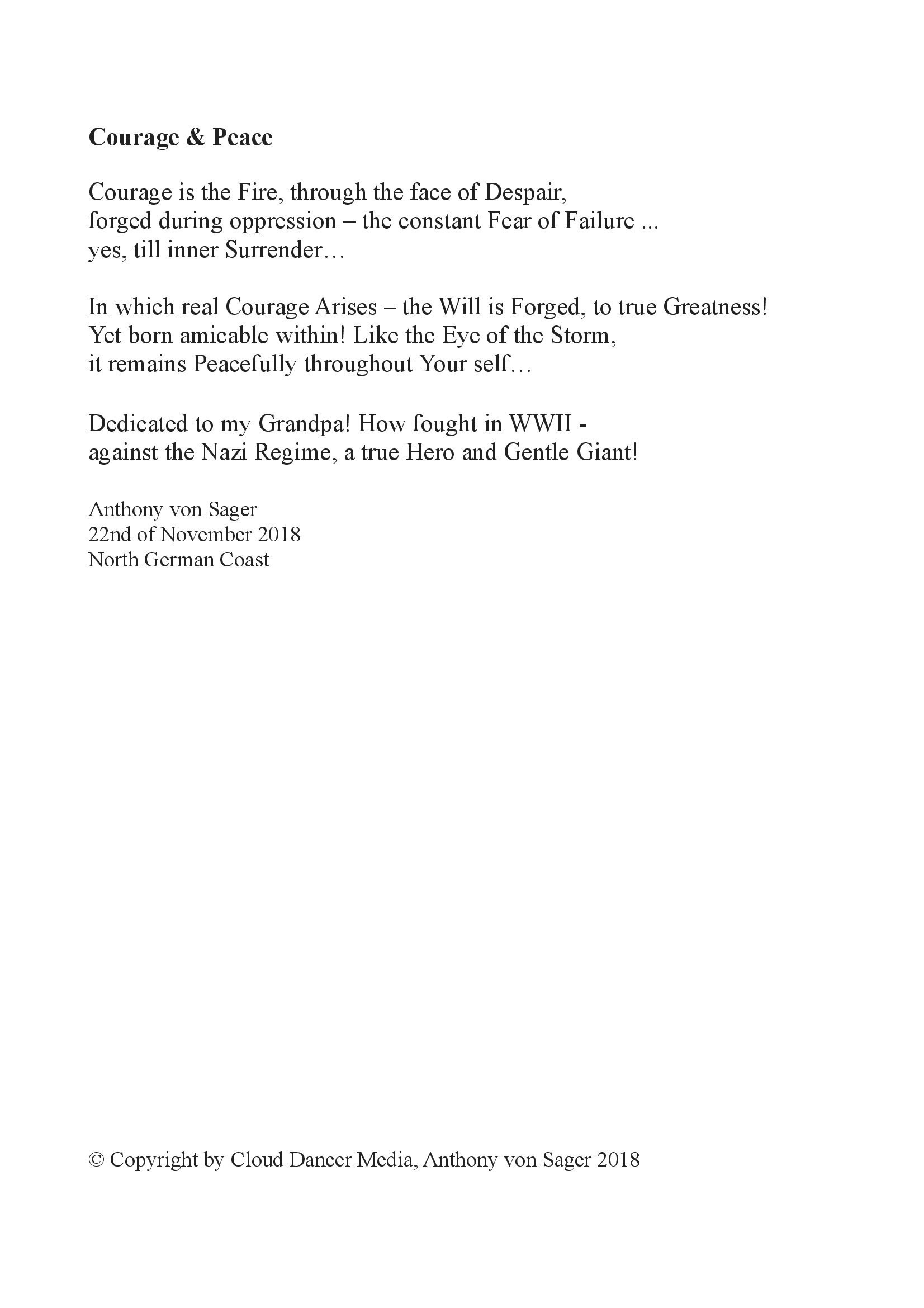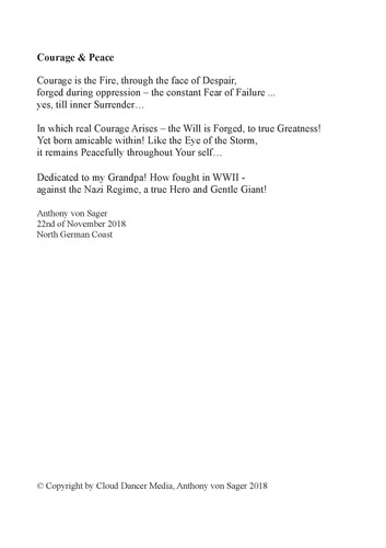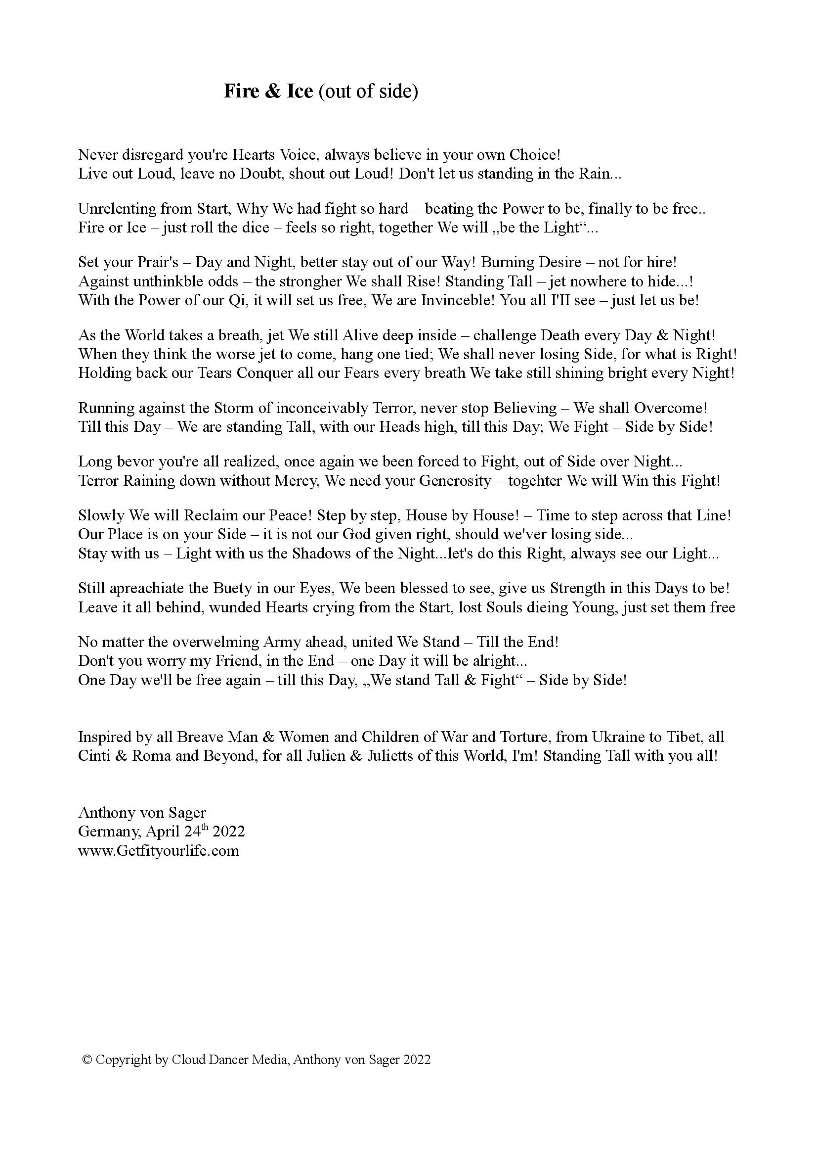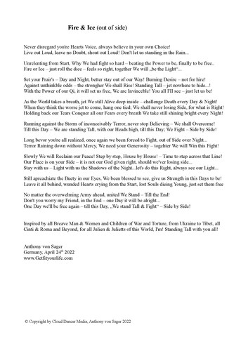 Short Story's; like Walk to Acceptance, Dark Nights & High Tieds, Walking my Way, You never Stand alone, Courage & Peace - Poems, as well see Below, Fire & Ice (out of Side) written for all People of War, (from Ukraine to Tibet, all Cinti & Roma and Beyond) in part abstracts of Book(s),