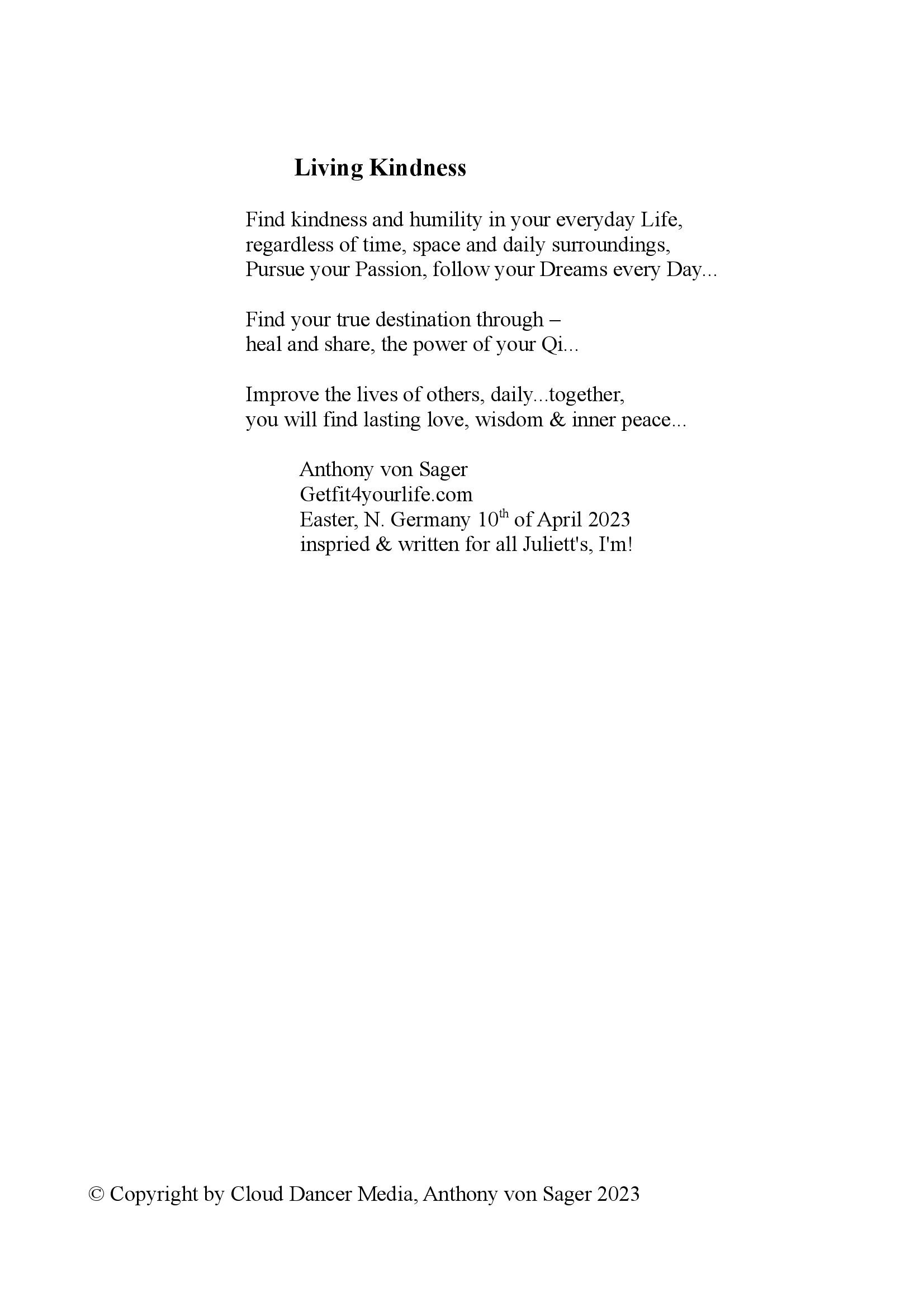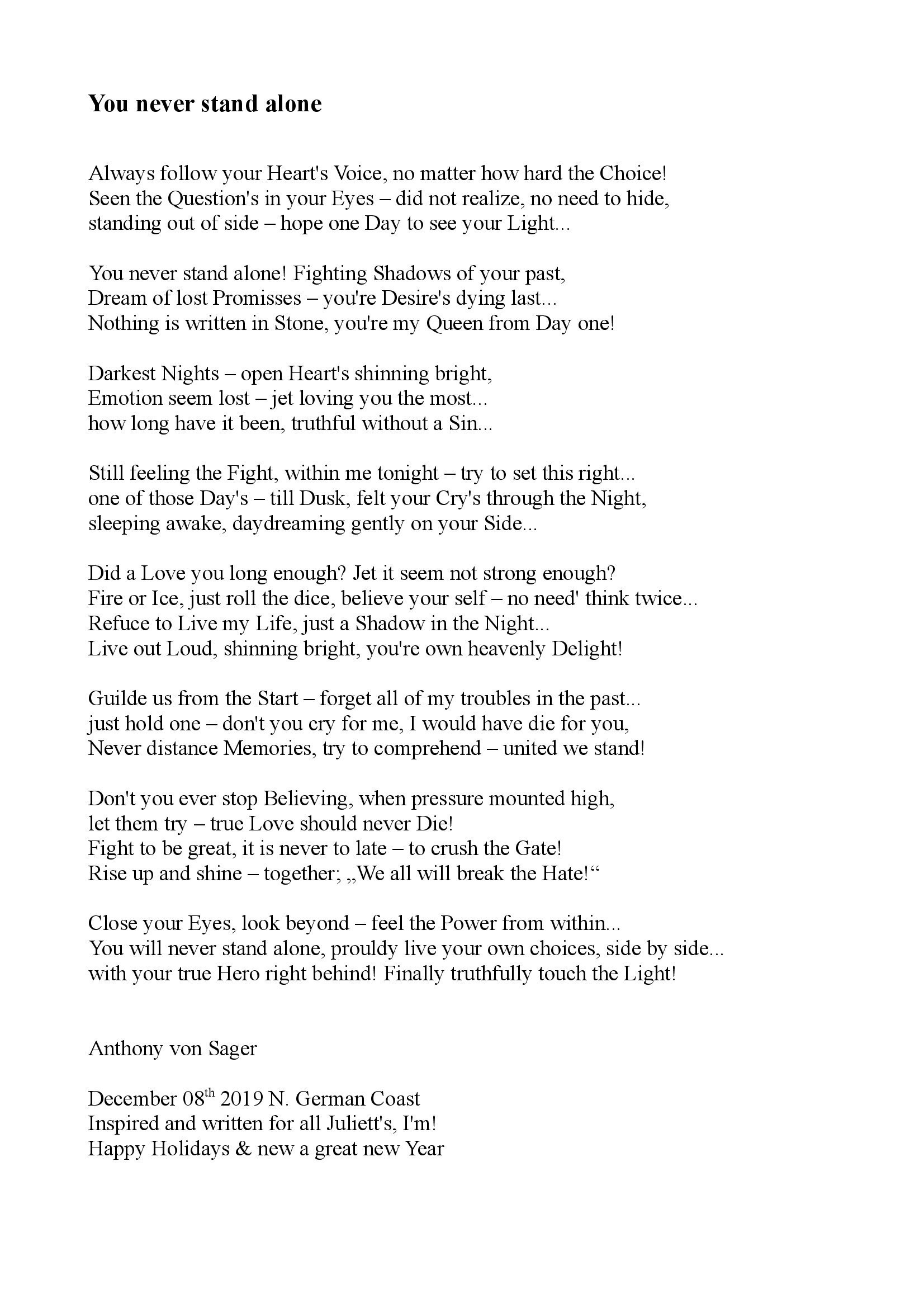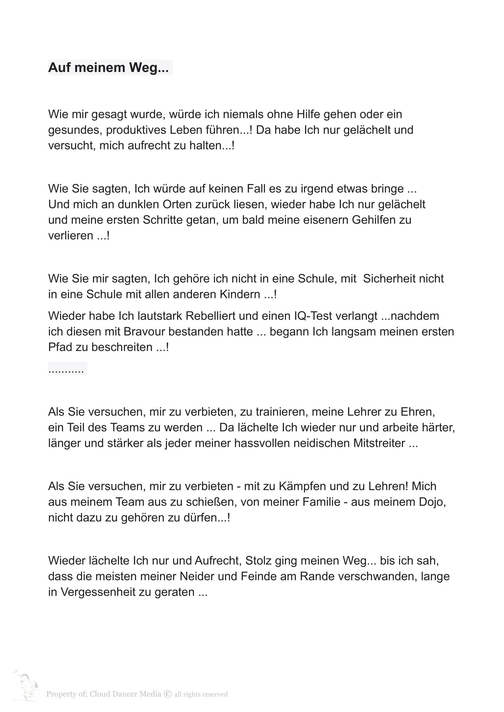 Short Story's; like Walk to Acceptance, Dark Nights & High Tieds, Walking my Way, You never Stand alone, Courage & Peace - Poems, as well see Below, Fire & Ice (out of Side) written for all People of War, (from Ukraine to Tibet, all Cinti & Roma and Beyond) in part abstracts of Book(s),